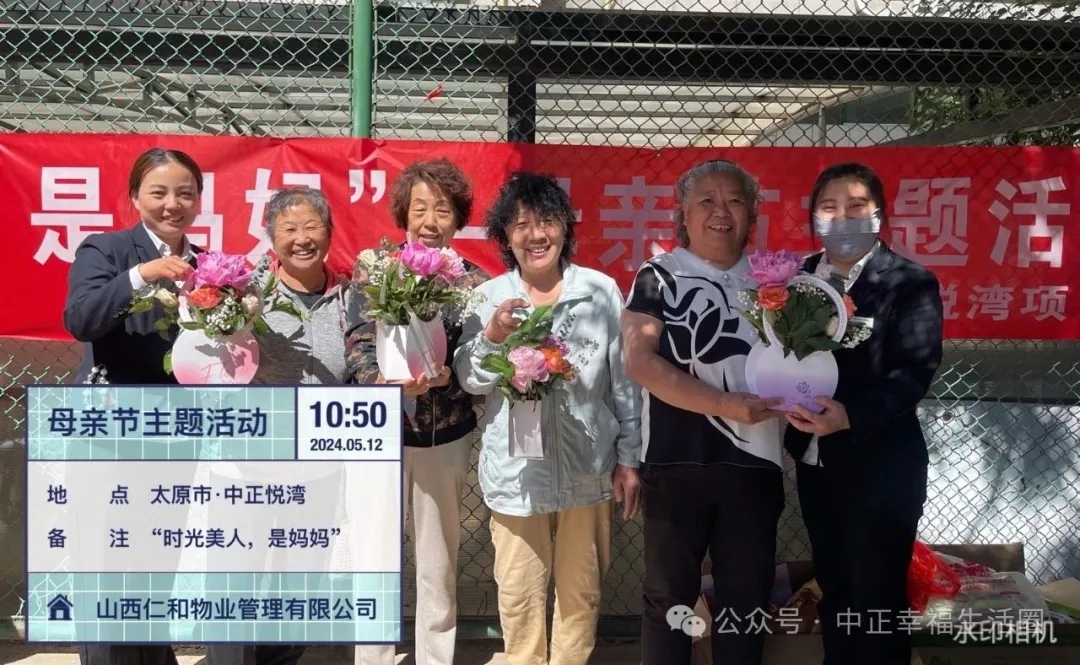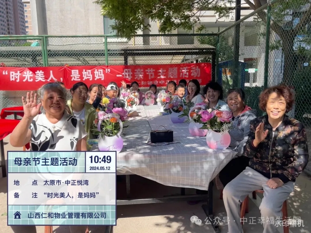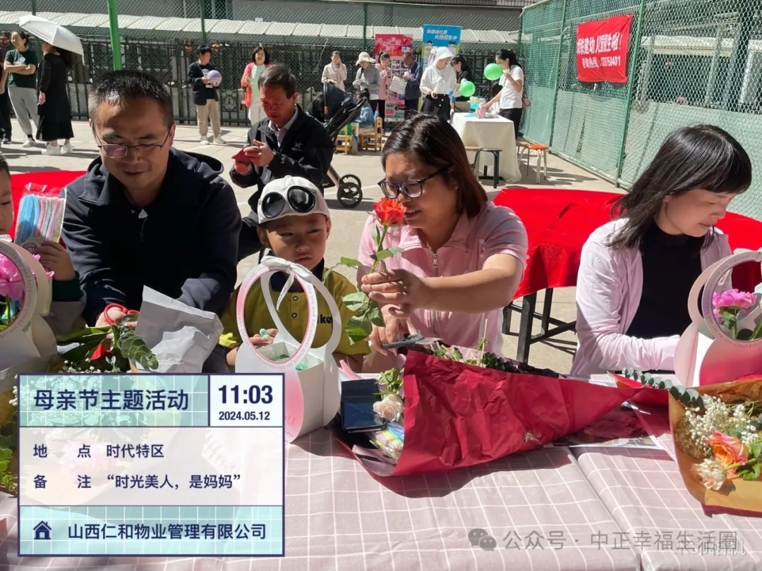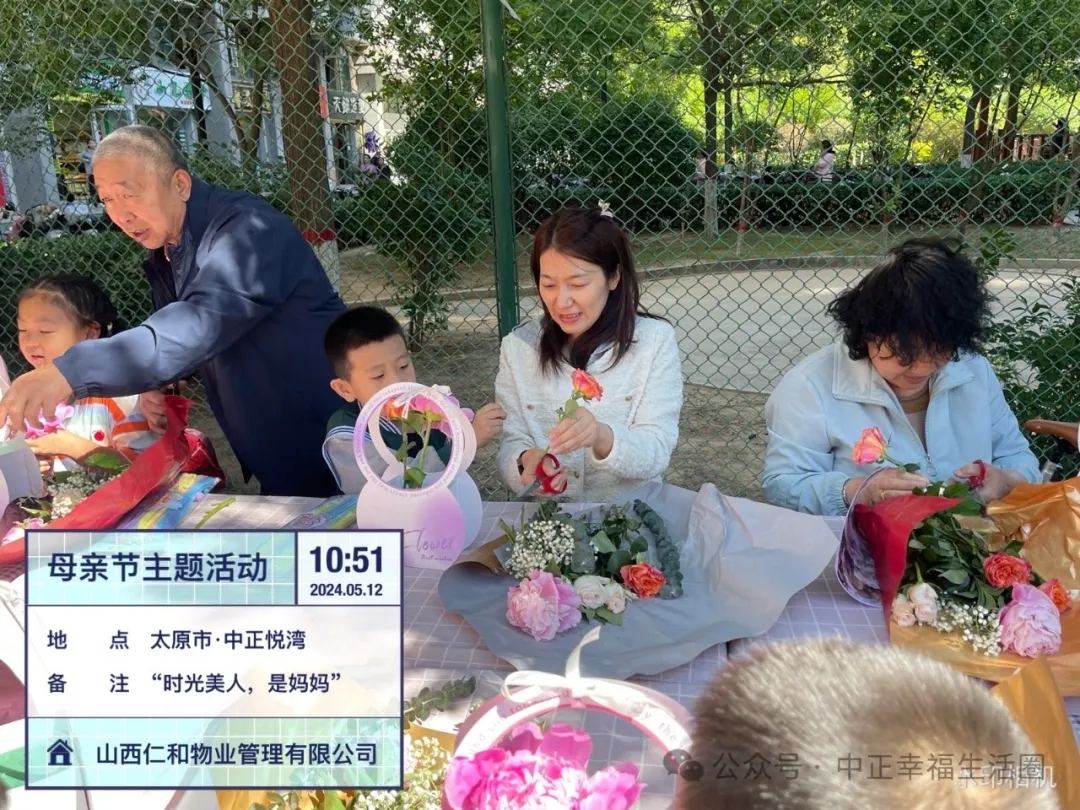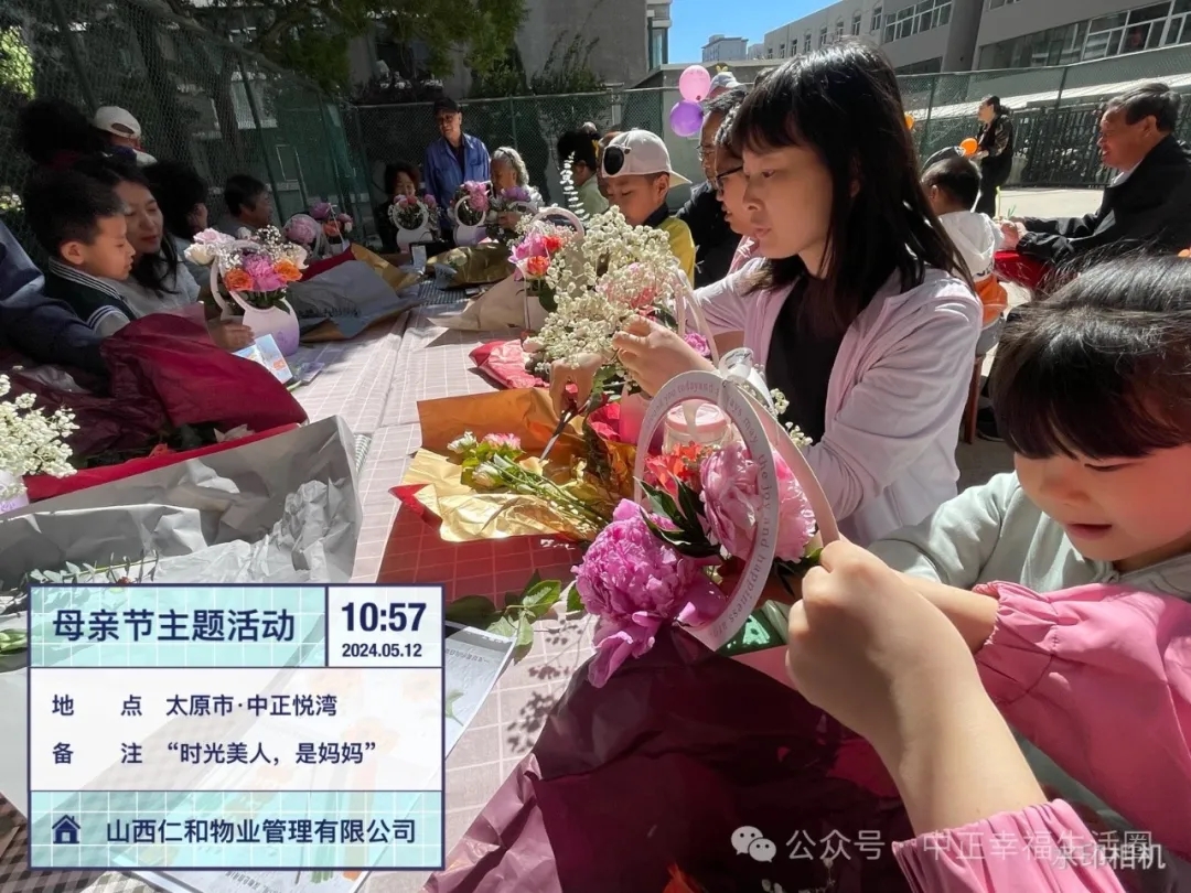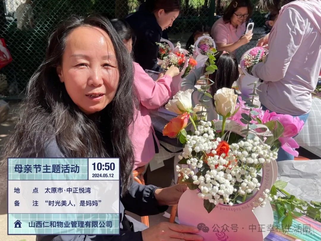 为传承中华民族的传统美德,进一步丰富小区业主生活,打造积极、健康、向上的社区氛围增进邻里关系,2024年5月12日上午山西仁和物业管理有限公司中正悦湾项目部开展了“时光美人,是妈妈”母亲节主题活动。本次活动以美丽的“鲜花”贯穿,活动现场到处弥漫着芬芳,让这个母亲节仪式满满!
